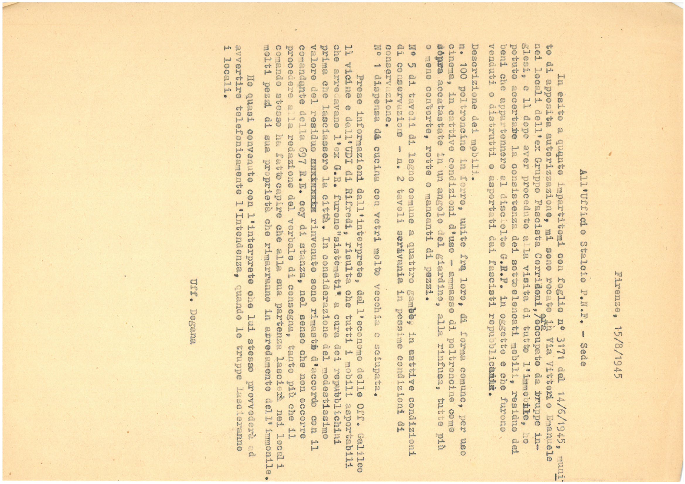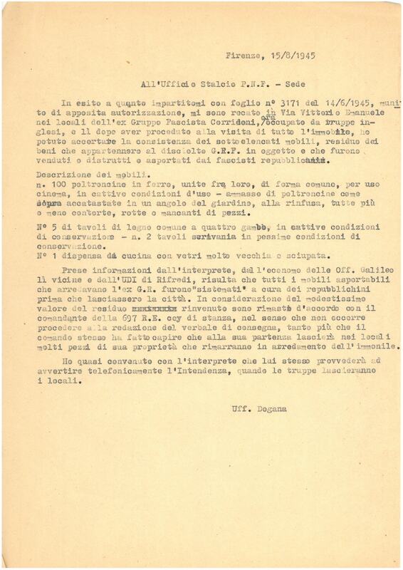 L'Ufficio Stralcio P.N.F. comunica all'Ufficio Dogana dell'Intendenza di Finanza che l'immobile posto a Firenze in via Vittorio Emanuele, occupato dall'ex Gruppo Fascicta Corridoni, è in procinto di essere lasciato libero dalle truppe inglesi. Contiene anche l'elenco dei bani mobili presenti nell'edificio.