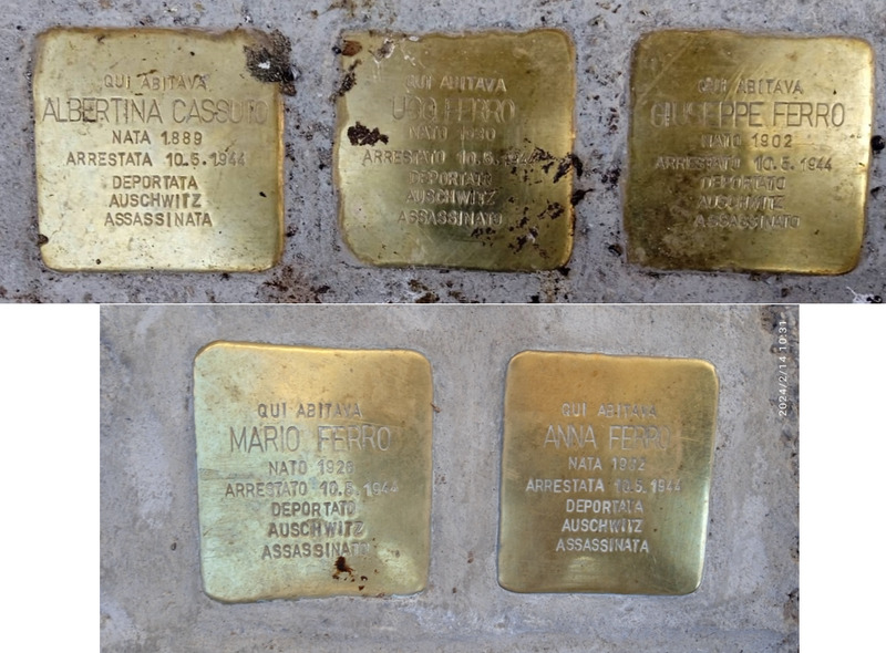 Le pietre sono collocate sul marciapiede e ricordano il luogo dove abitava Giuseppe Ferro nato nel 1902 con la moglie Albertina Cassuto nata nel 1889 e i figli Mario nato nel 1926, Ugo nato nel 1930 e Anna nata nel 1932. Tutta la famiglia fu arrestata il 10 aprile 1944, deportata e assassinata ad Auschwitz.